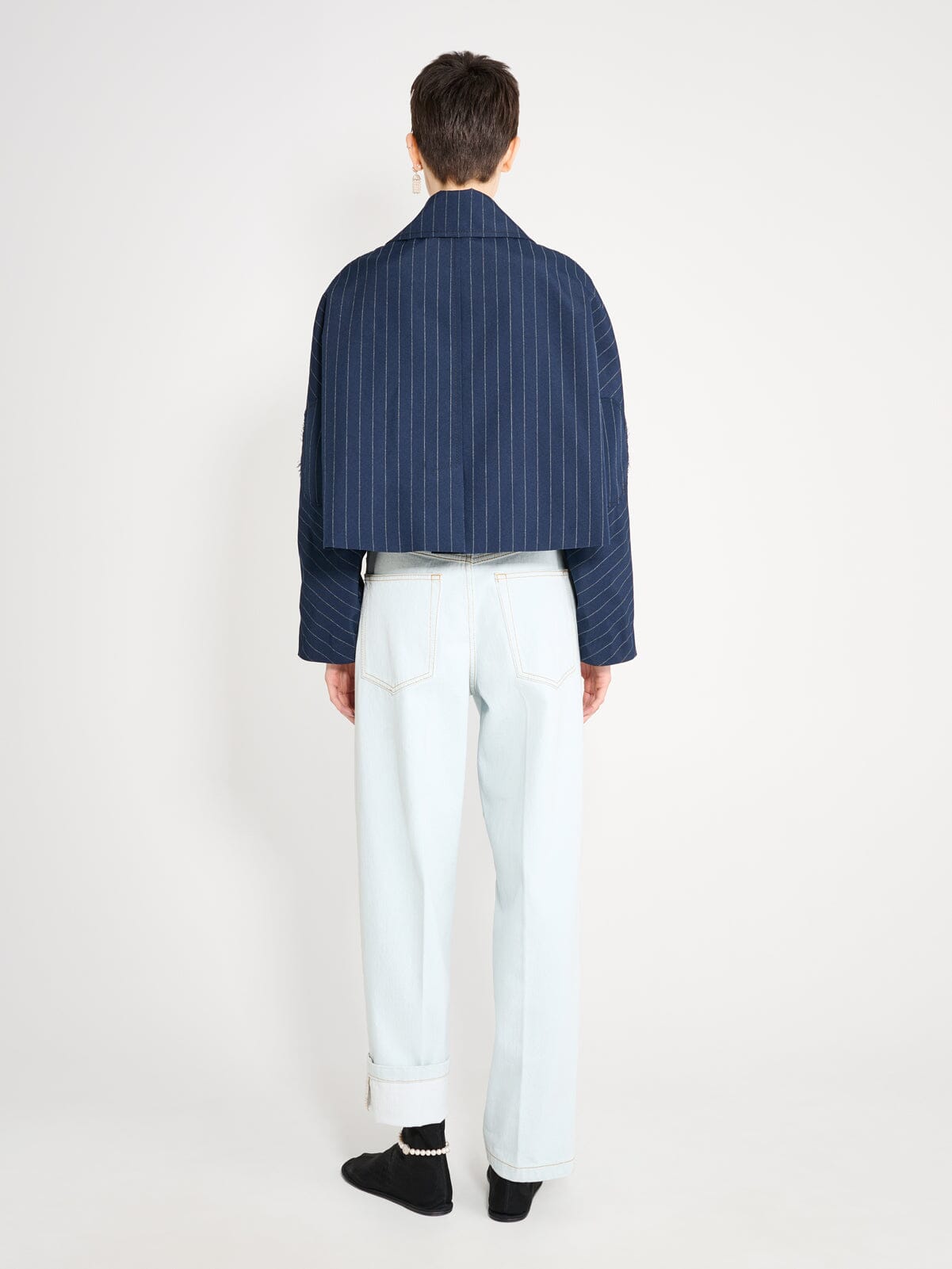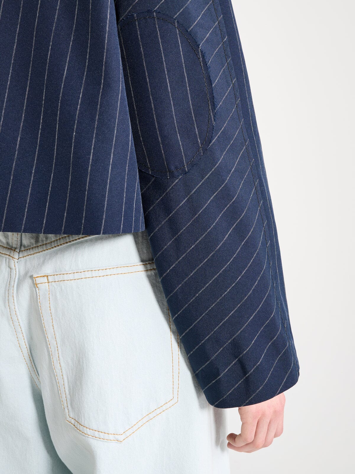 Piping details on the exterior. Lining on the interior. Detachable scalloped piece at the neck for a polished look, whilst the arms have elbow patches.