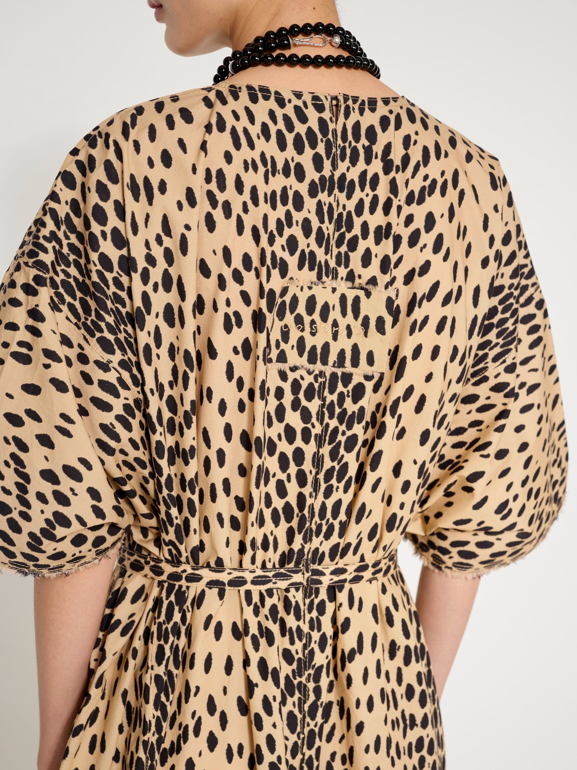For when winter gets the best of you, it's time to pull out Lee's Kaftan. With its papery leopard touch, the sleeves have raw edging whilst our hallmark embroidered patch sits quietly within. This Nackiyé garment is made from a fabric shaped by unique artisanal techniques. Its gentle variations, in weave, shine, and touch, lends to its distinctive drape and texture.