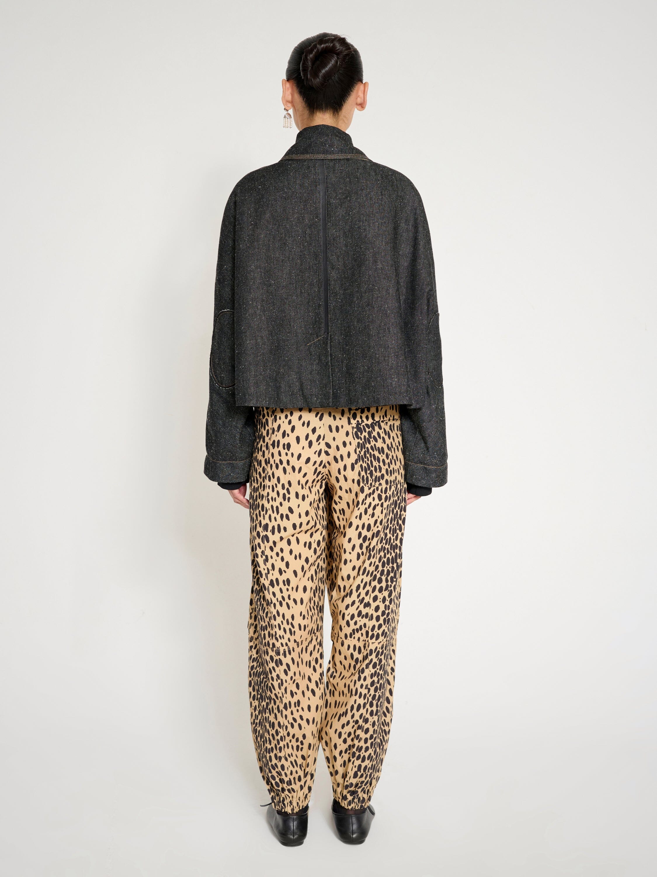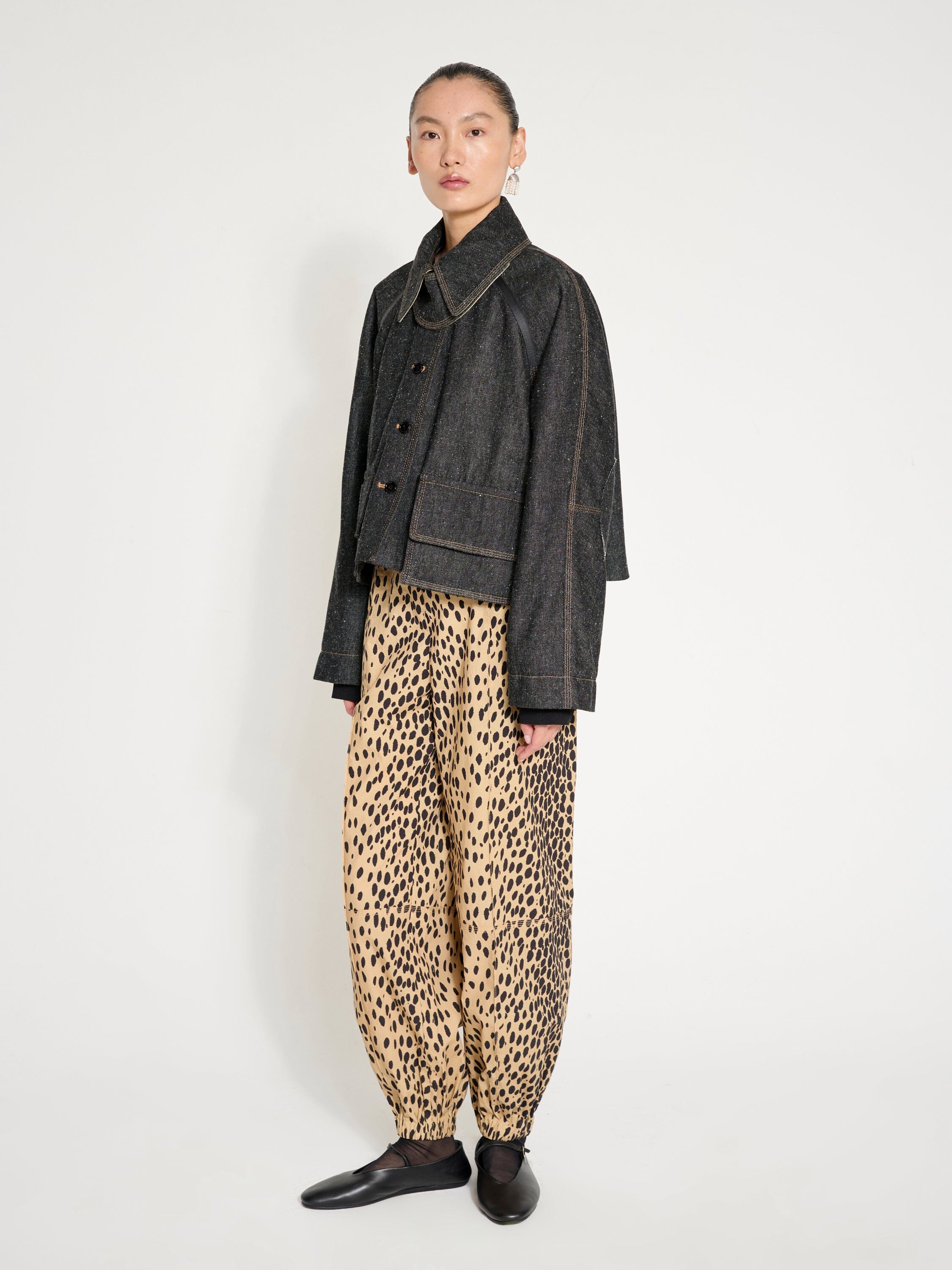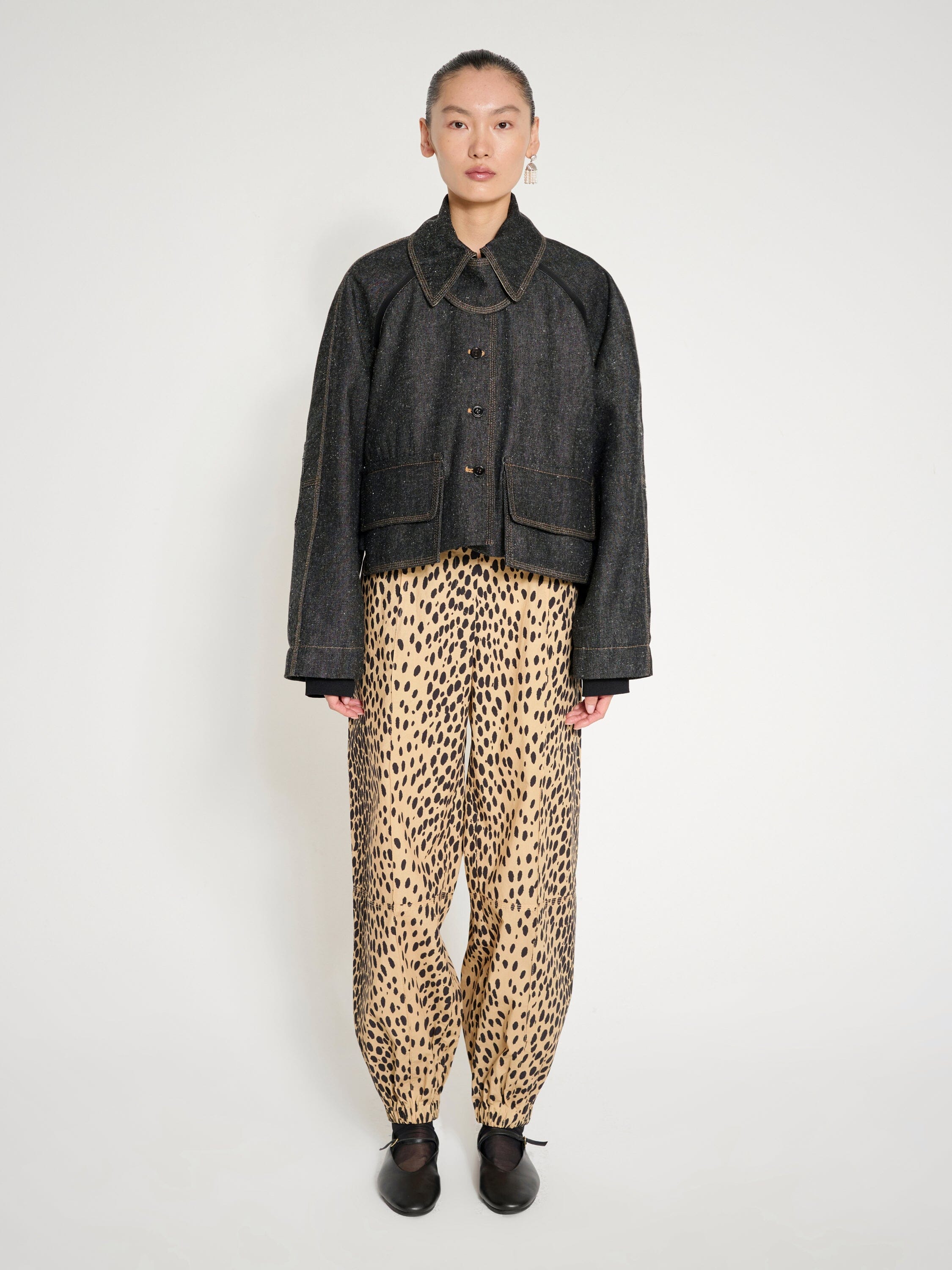 Our Precious Cargo in Indigo Raw, developed in collaboration with expert Japanese denim artisans, is made from an unprocessed drill denim consisting of a one of a kind virgin wool and silk. A particularly supple fabric for denim, it features hand draped semi attached front square pockets, detachable scalloped neck closure for a polished look, whilst the arms have elbow patches. The shoulder seam, decorated with a light rubber edging, cuts across from the neck to the underarm, providing for an easy and comfortable fit. Contrast stitching completes the Precious Cargo. The denim has not been washed or treated.