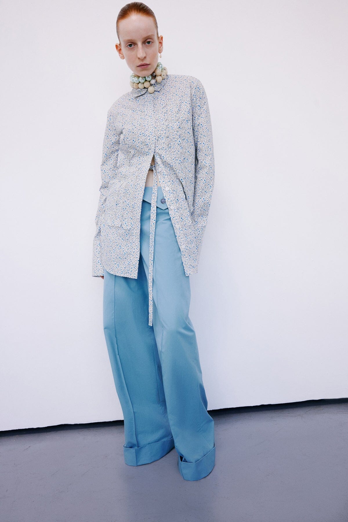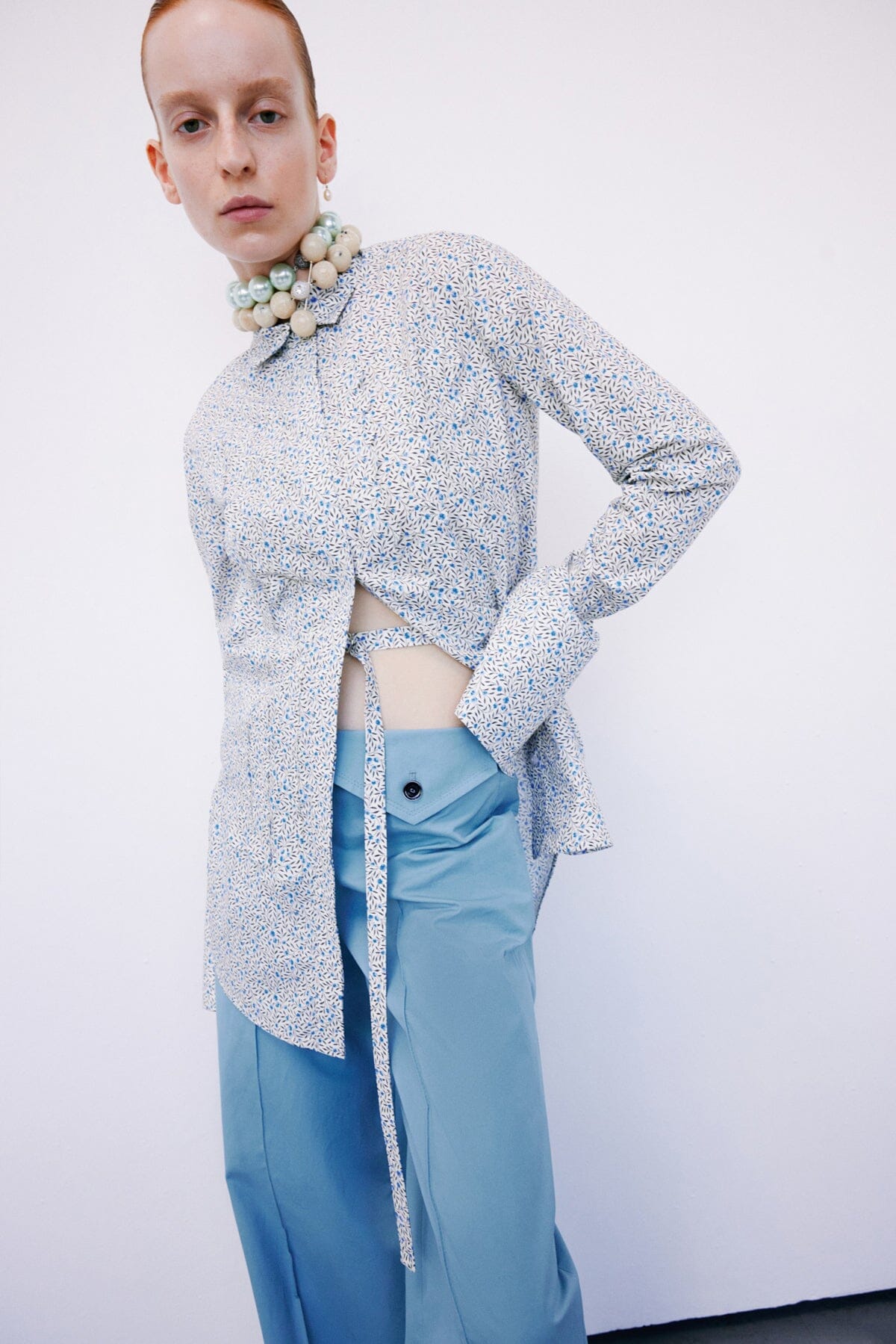 Long Sleeved Shirt with Scalloped details & belt. Hidden buttons. Scallop Front Shirt Details. Exaggerate Cuffs.