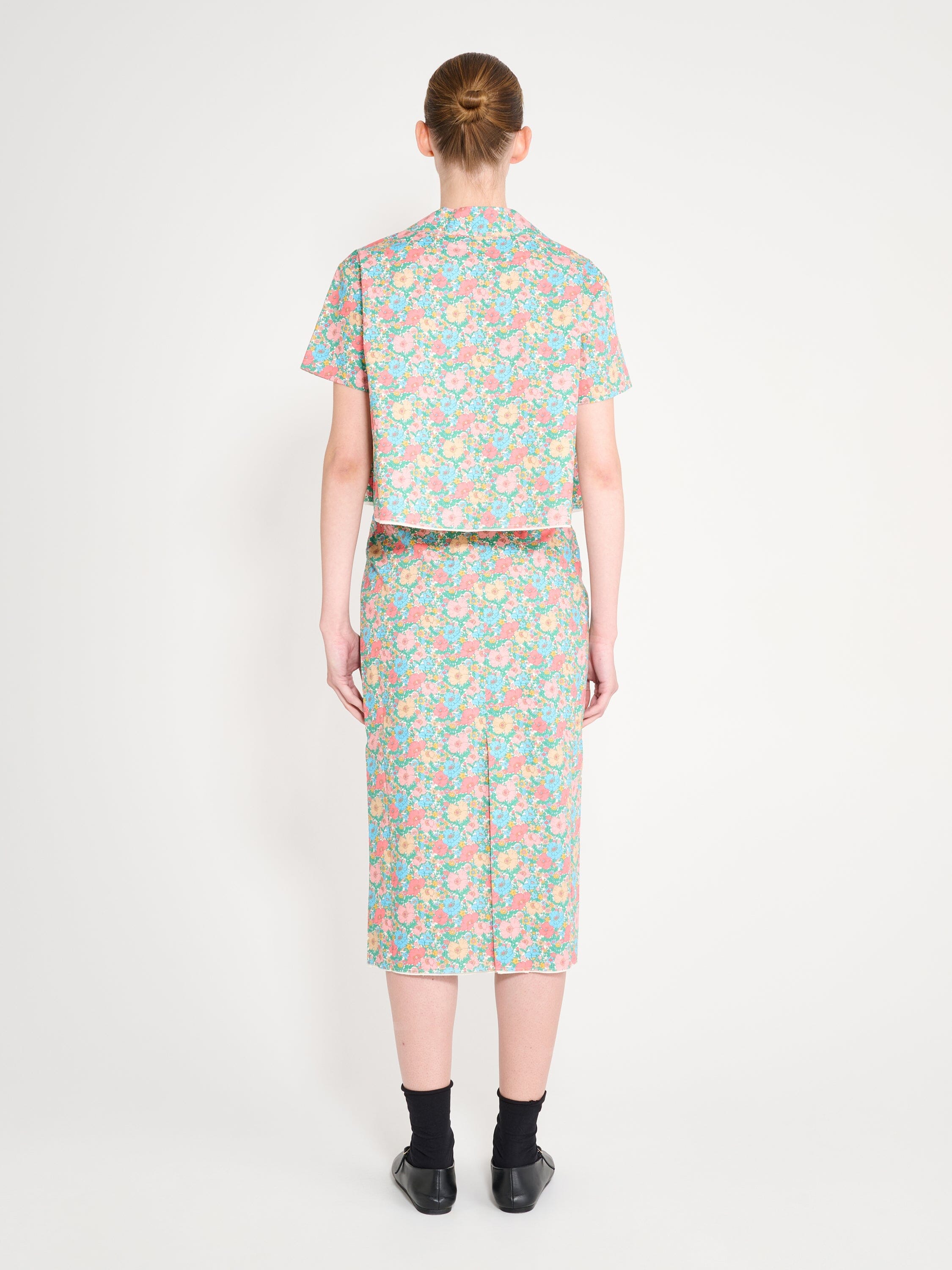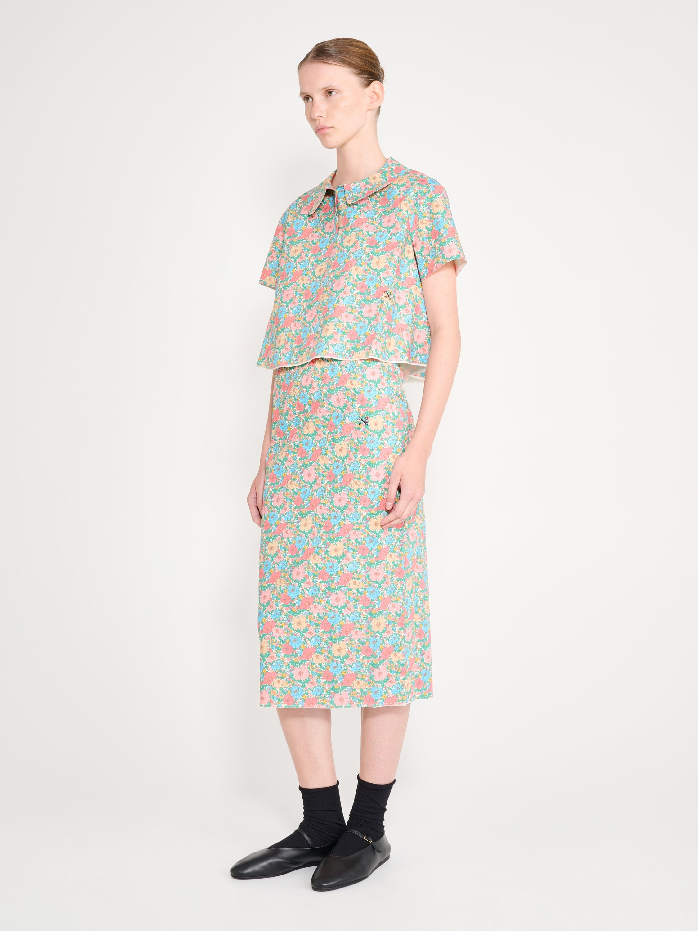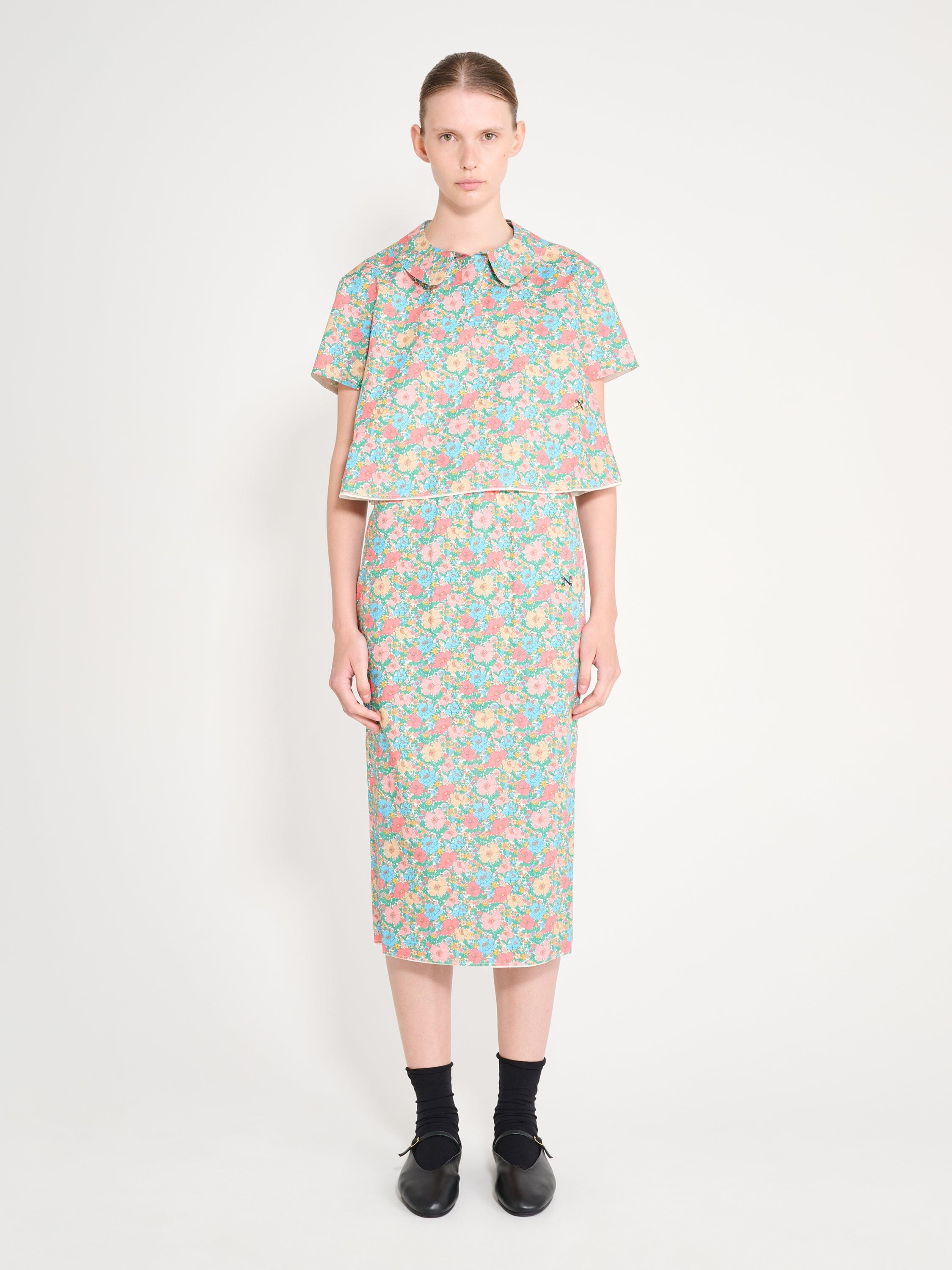Kennedy is a take on the 60s style slip on top with a relaxed open collar, feminine floral print and A-line silhouette. A white cotton slip underneath reveals itself at the hem for a delicate touch to this piece. Embroidered 'N' hallmark.