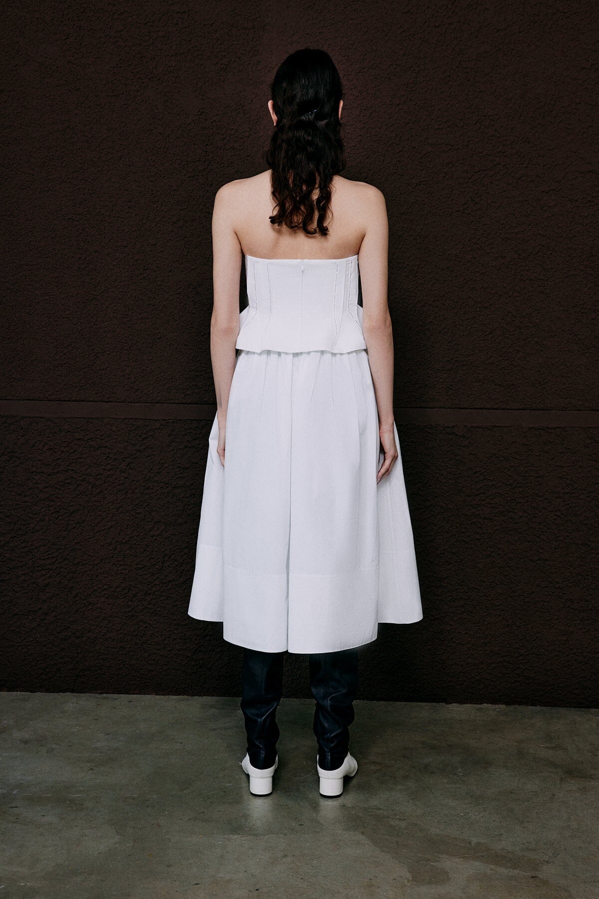 Bustier dress with pin tuck detail and slits on sides. Inner bustier is lined with small hooks & partly ruched on the back. Zip on the outside.